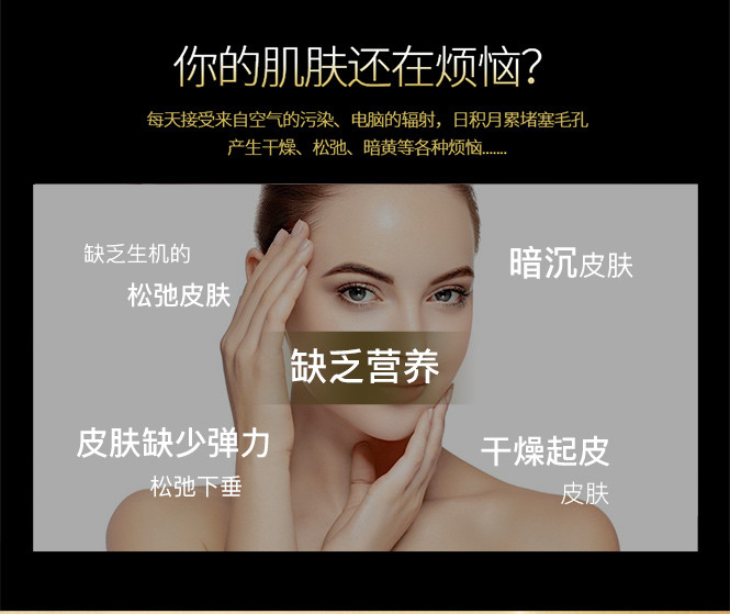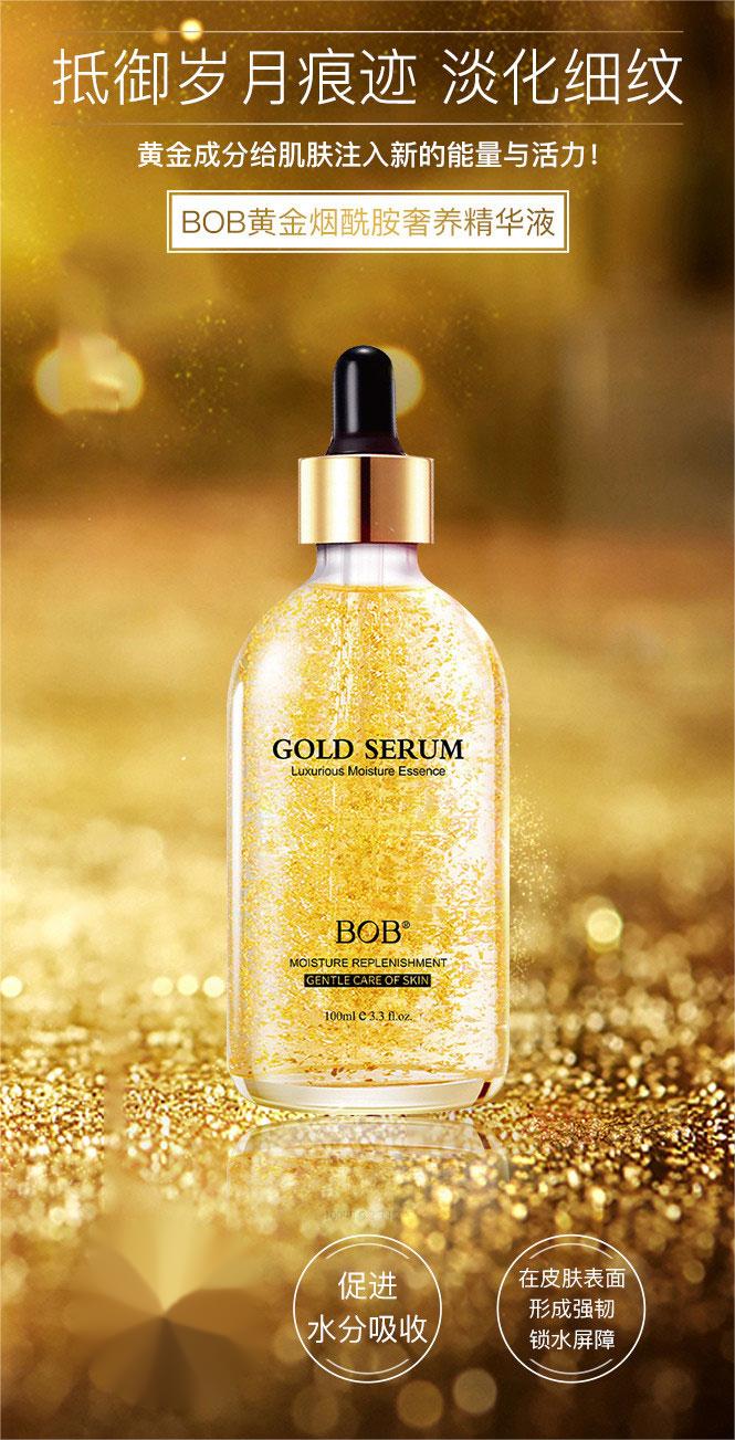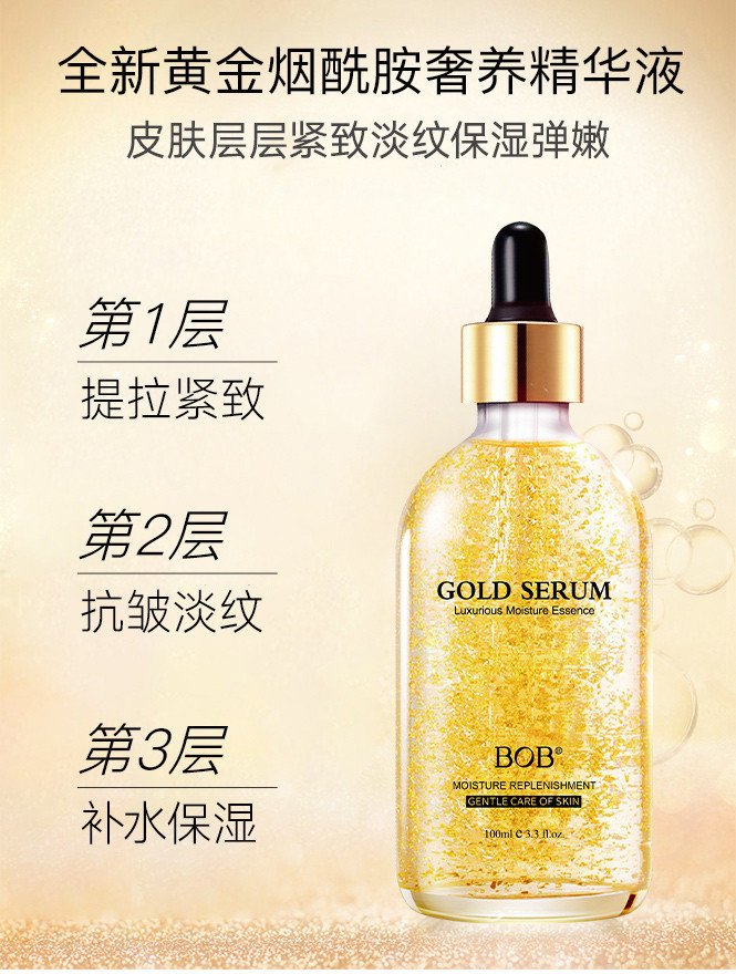 黄金精华液含烟酰胺,金等活性成分,深层滋润,紧致肌肤,改善干燥,粗糙无光泽等肌肤现象,还可以保湿补水,改善皱纹,淡化细纹,呵护肌肤屏障